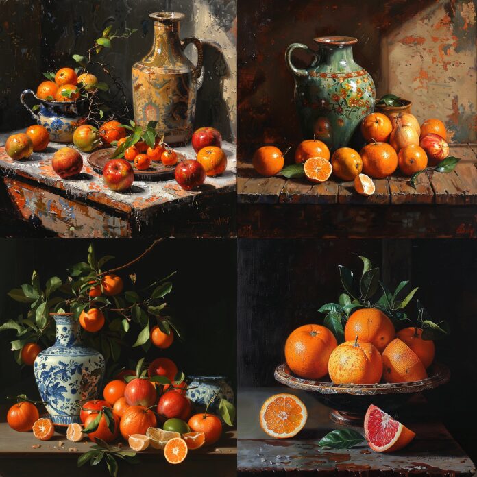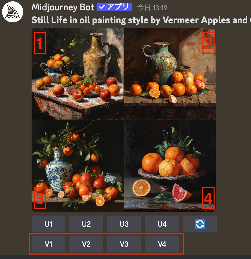 例: /imagine Still Life in oil painting style by Vermeer Apples and Oranges (静物画 油絵風 by Vermeer リンゴとオレンジ)