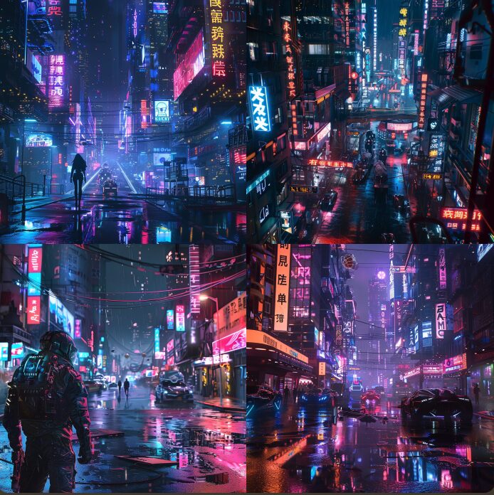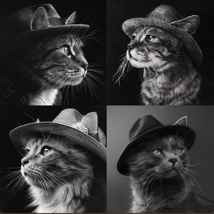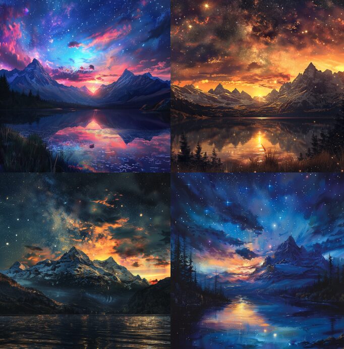 /imagineMajestic mountains, sunsets, lakes, starry skies, fantastic, beautiful. (雄大な山脈、夕焼け、湖、星空、幻想的、美しい)/imaginefuturistic city, cyberpunk, neon, robot, night view, movie scene(未来都市、サイバーパンク、ネオン、ロボット、夜景、映画のワンシーン)/imaginePortrait of a cat, realistic, wearing a hat, black and white(猫の肖像画、リアル、帽子をかぶっている、モノクロ)