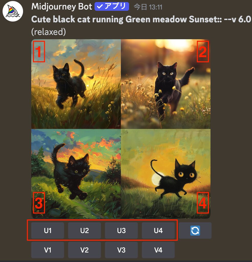 生成された画像は、アップスケールすることで高画質化できます。画像下部に表示されるUボタン (U1 – U4) をクリックして、好みのアップスケールレベルを選択しましょう。