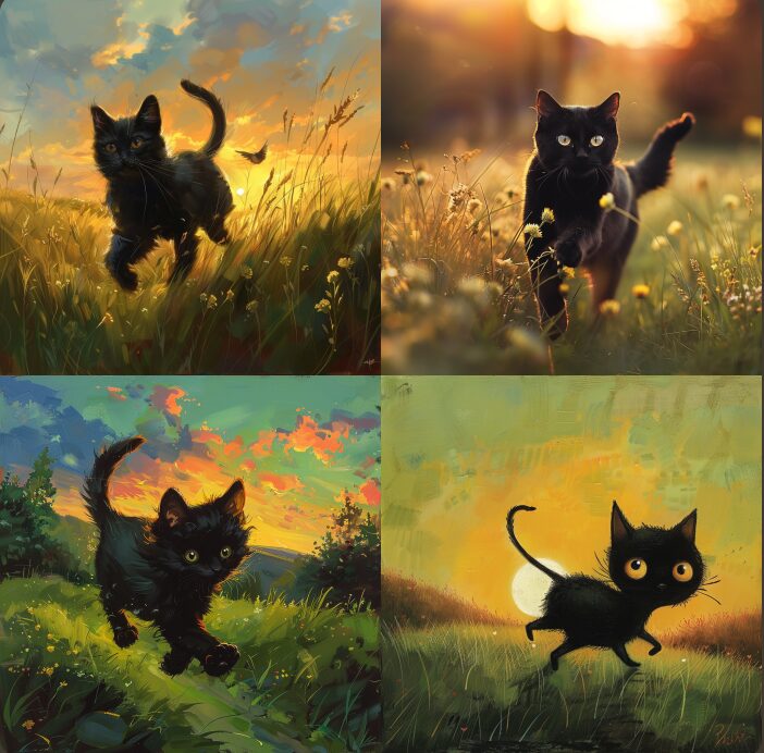 /imagineCute black cat running Green meadow Sunset (可愛い 黒猫 走る 緑の草原 夕焼け)