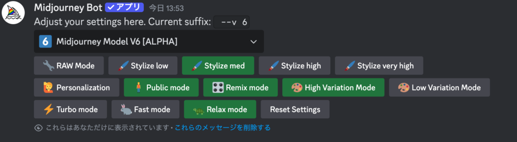 Remixモードを使用すると、一度生成した画像のプロンプトを調整して再生成できます。/settings コマンドで設定画面を開き、Remix modeをオンにしましょう。